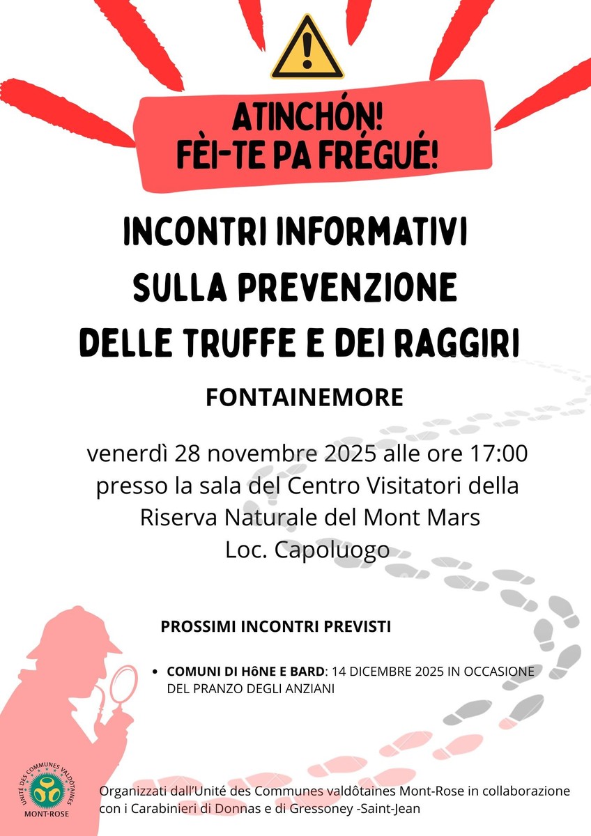 Il progetto, dal titolo emblematico in patois “Atinchón! Fèi-te pa frégué” (“Attenzione! Non farti fregare”), mira a informare e sensibilizzare la popolazione sui rischi di truffe e raggiri, un fenomeno purtroppo in aumento anche nei piccoli centri e sempre più spesso legato all’uso delle nuove tecnologie.