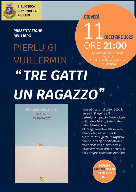 Dopo 'Palanka. Brevi raccomandazioni per chi si reca in Valle d’Aosta' (Manni, 2012) e 'Come una pietra che cade. Esercizi di sopravvivenza in provincia' (Mimesis, 2020), Pierluigi Vuillermin ha concluso la sua personale 'trilogia dell’orfanitudine' con Tre gatti. Un ragazzo (CN, 2025), disponibile in libreria e sulle piattaforme di bookshop online.