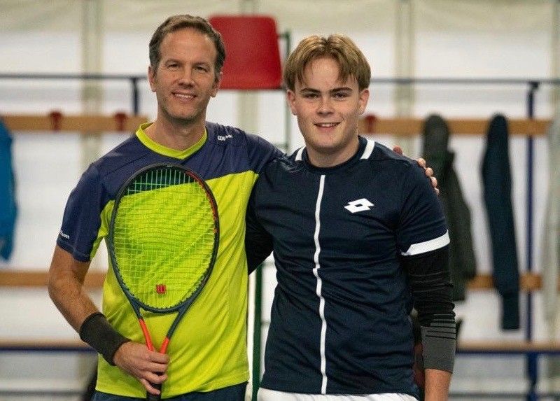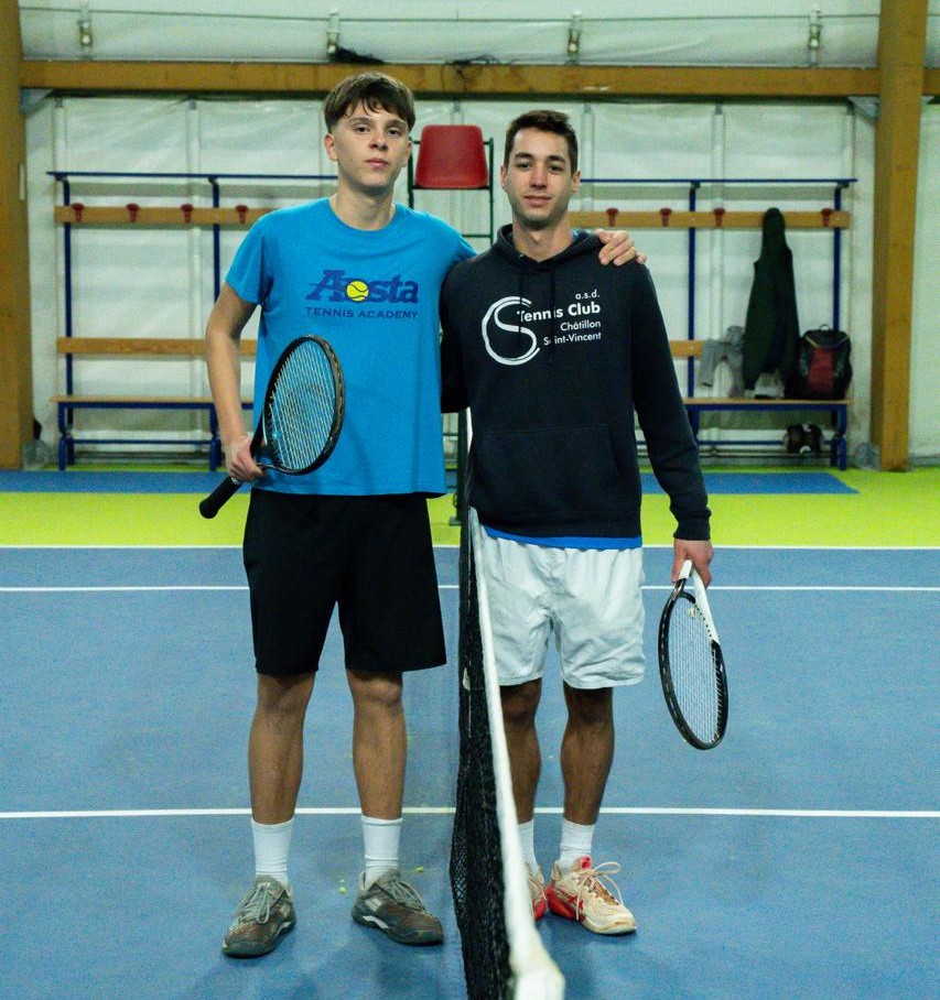La giornata ha visto anche due ritiri. Tovagliari, tornato in campo in serata contro il milanese Ermis Emmanuil Schmitt (Cantera Tennis Team), ha dovuto fermarsi sul 6/4, 5/3 per l’avversario. Destino analogo per Marco Bich (TC Squash Sarre), costretto a lasciare il campo contro Davide Freydoz (TC Châtillon St-Vincent) quando il punteggio segnava 6/0, 2/0. Esordio convincente, invece, per Davide Floris (TC Châtillon St-Vincent), che ha superato con autorità Mattia Duc (Aosta Tennis Academy, nella foto sotto assieme a Davide Floris) per 6/3, 6/1, mentre Massimo Prini (TC Domodossola) ha avanzato senza giocare a causa dell’assenza di Francesco Miele (Aosta Tennis Academy).
