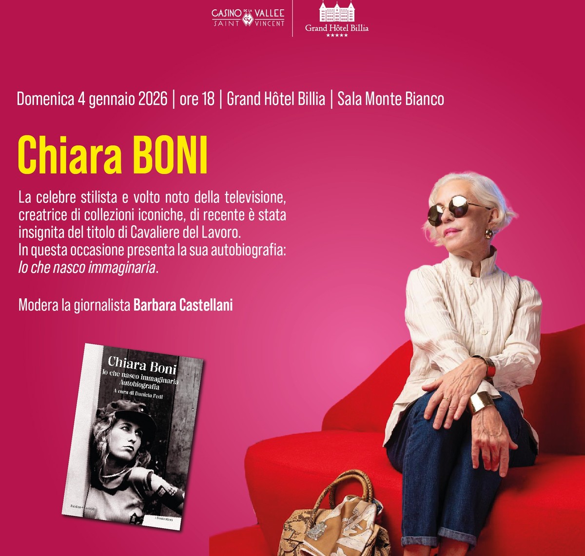 Domenica 4 gennaio sarà invece dedicata alla moda e al racconto personale con l’incontro con Chiara Boni, stilista di fama internazionale. Nel suo libro autobiografico 'Io che nasco immaginaria', Boni ripercorre il proprio percorso umano e creativo, mettendo a nudo la sua anima e la visione che ha guidato il suo successo. Una carriera costruita con determinazione e immaginazione, che l’ha portata a imporsi nel panorama della moda italiana e internazionale. Un riconoscimento suggellato anche dall’onorificenza di Cavaliere del Lavoro, conferitale dal Presidente della Repubblica. L’incontro offrirà al pubblico un’occasione di ascolto e riflessione su stile, identità e creatività.