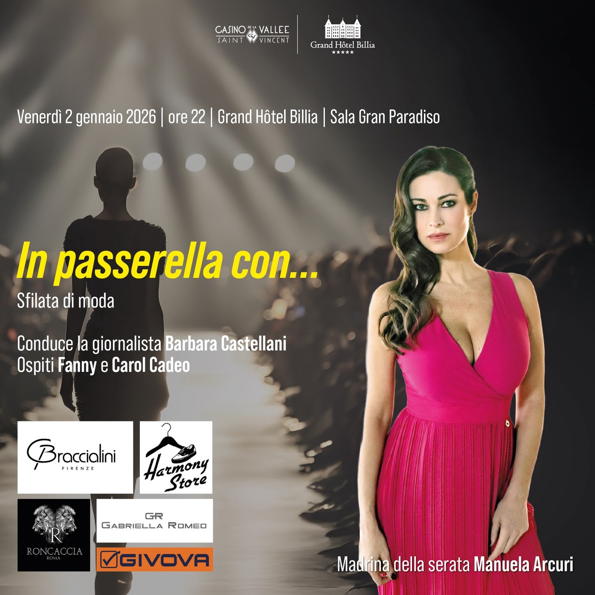 E a seguire, con la conduzione della giornalista Barbara Castellani, il calendario dei primi giorni di gennaio prevede grandi, imperdibili eventi. Già oltre 200 prenotazioni per venerdì 2 gennaio, con in programma un fashion show nella Sala Gran Paradiso del Grand Hôtel Billia. In passerella sfileranno sedici modelle che presenteranno una selezione di brand italiani ed esteri, offrendo uno spaccato attuale del mondo della moda. Tra i marchi presenti figura anche Harmony Store di Saint-Vincent, a testimonianza del legame con il territorio. La serata vedrà la partecipazione di Fanny e Carol Cadeo, mentre madrina dell’evento sarà Manuela Arcuri, volto noto del cinema e della televisione italiana. Guest star musicale sarà Gazebo, protagonista del concerto in programma il giorno successivo. Un appuntamento che unisce stile, glamour e intrattenimento.