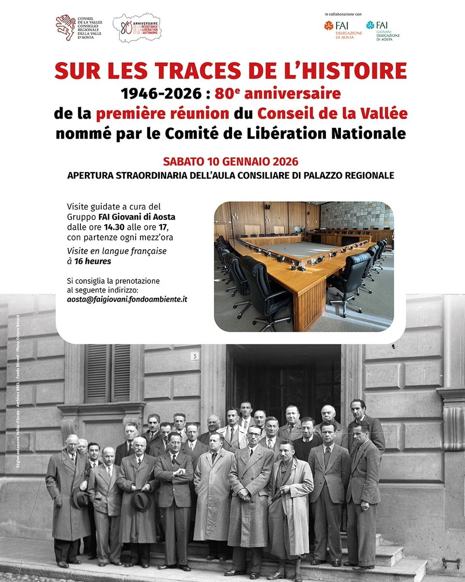 In occasione dell’80esimo anniversario della prima seduta del Consiglio Valle nominato dal Comitato di liberazione nazionale-Cln, sabato 10 gennaio 2026 l’Assemblea legislativa valdostana aprirà le proprie porte ai cittadini con una serie di visite guidate negli spazi istituzionali di Palazzo regionale, in piazza Deffeyes ad Aosta.