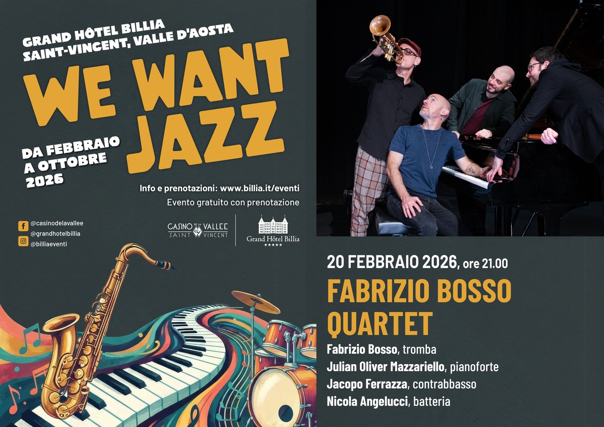 Torna per il terzo anno consecutivo We Want Jazz, la rassegna musicale promossa dal Casino de la Vallée al Grand Hôtel Billia di Saint-Vincent, che accompagnerà il pubblico da febbraio a ottobre 2026 con un calendario di sette concerti jazz dal vivo, tutti a ingresso gratuito.