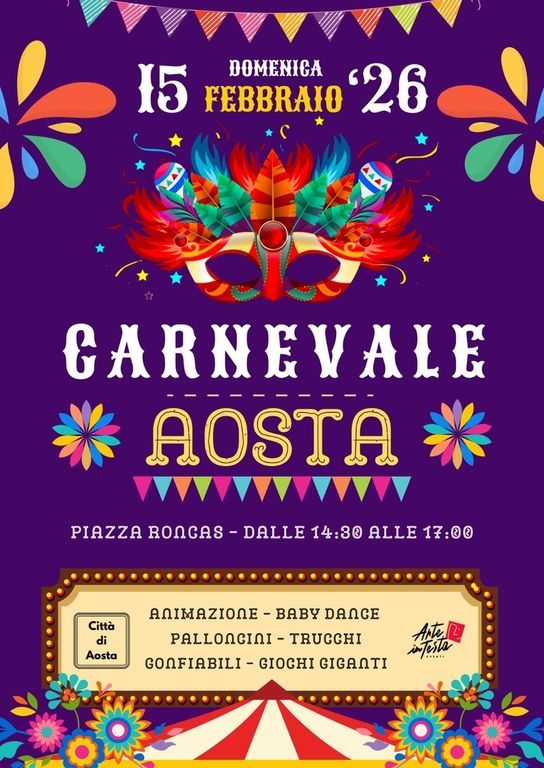 Aosta si prepara a vivere un pomeriggio all’insegna dei colori, della musica e del divertimento con il “Carnevale di Aosta”, in programma domenica 15 febbraio in piazza Roncas, dalle 14,30 alle 17, su iniziativa dell’Amministrazione comunale. L’evento è pensato soprattutto per bambini e famiglie e punta a trasformare il cuore della città in un grande spazio di festa e condivisione.