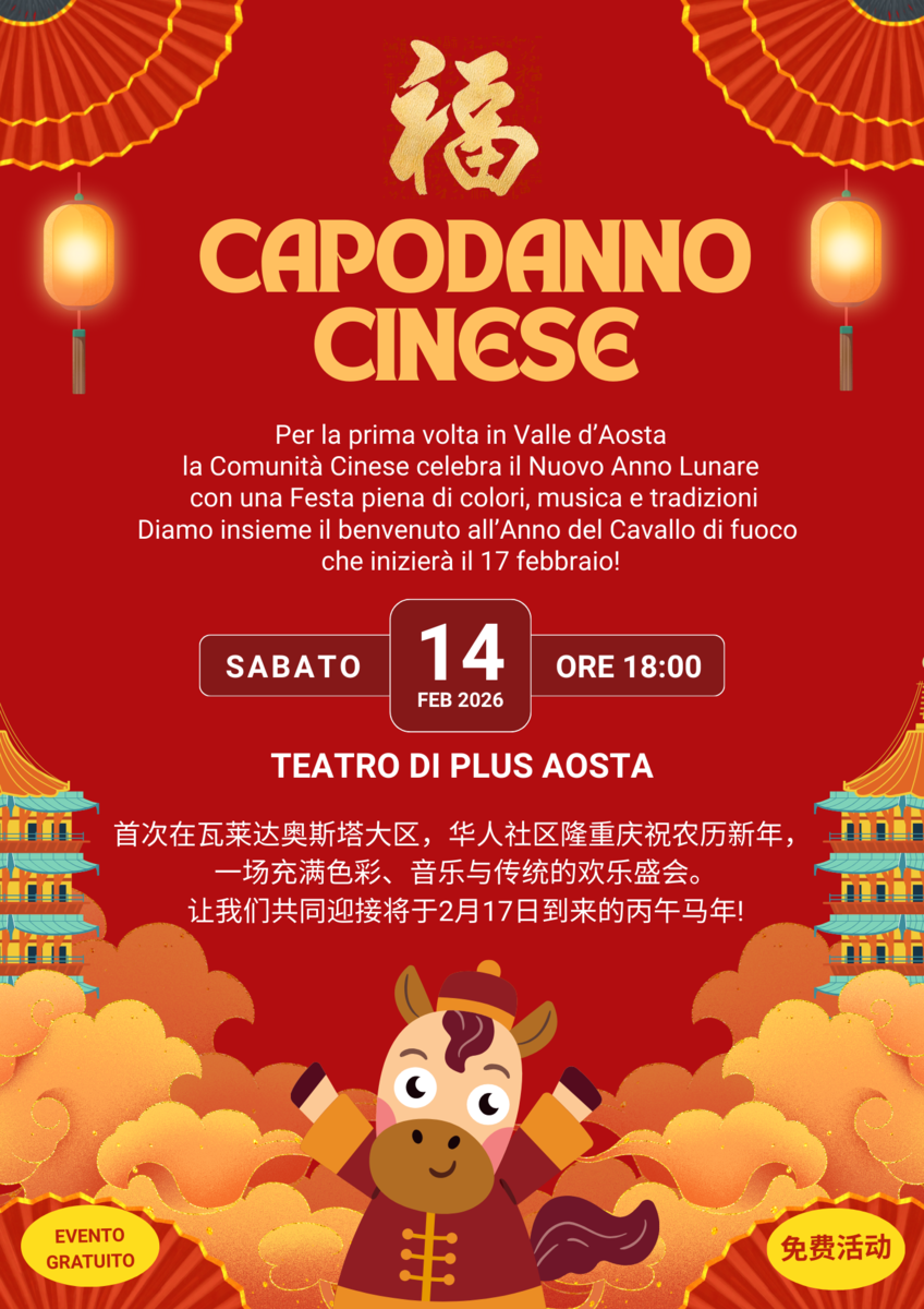 Per la prima volta in Valle d’Aosta verrà festeggiato il Capodanno Cinese, la più importante giornata tradizionale asiatica. Organizzato dall'Associazione italiana di sport outdoor per giovani cinesi d'oltremare, dal Centro di cultura cinese Aosta, in collaborazione con Plus Aosta e il progetto FAMI FONDO ASILO MIGRAZIONE E INTEGRAZIONE 2021-2027, l’evento è a Plus, in via Garibaldi 7 ad Aosta, sabato 14 febbraio, anticipando di qualche giorno la data ufficiale del nuovo anno lunare.
