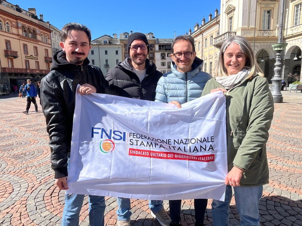 I giornalisti di quotidiani, periodici, agenzie di stampa, testate web, televisioni e radio a diffusione nazionale si sono astenuti dal lavoro per 24 ore e un presidio è stato organizzato ieri mattina in piazza Chanoux, organizzato dall'Associazione stampa valdostana-Asva e al quale hanno preso parte delegazioni delle diverse testate giornalistiche valdostane (presente il direttore de Laprimalinea.it. Patrizio Gabetti, anche in rappresentanza del sindacato Figec, da pochi mesi operativo in Valle).