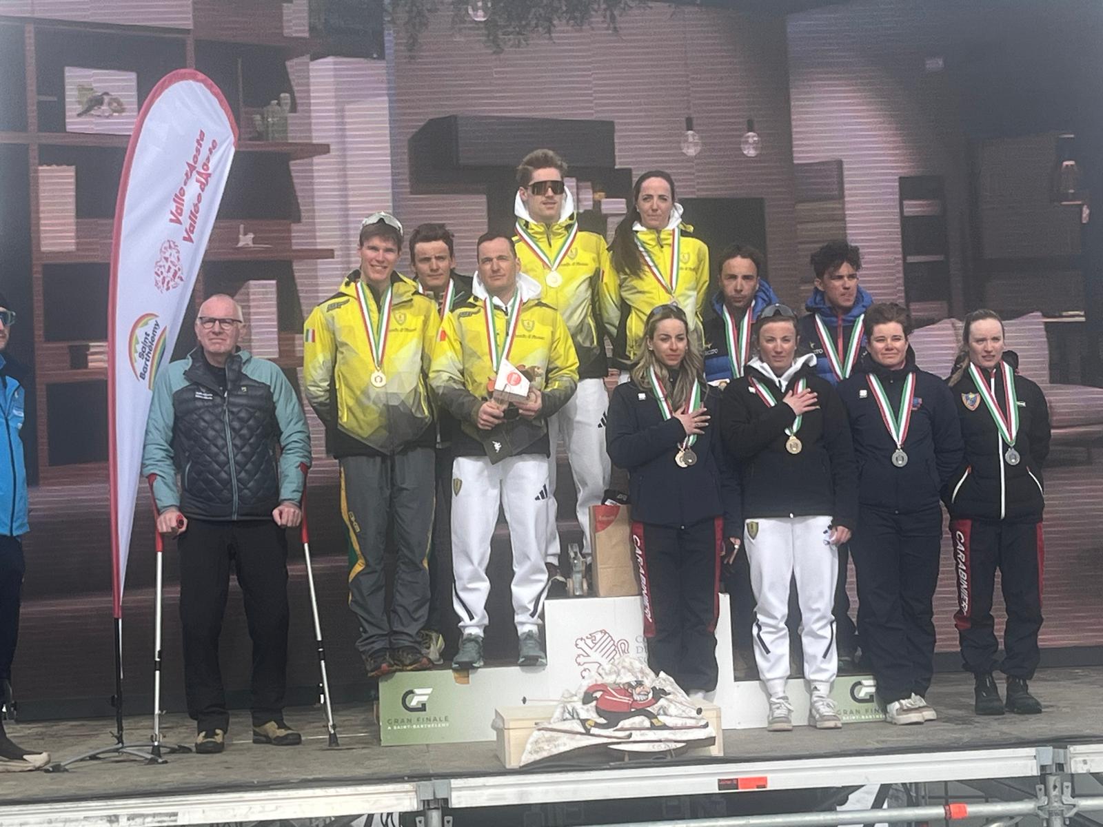 Sul traguardo la moglie ed ex fondista azzurra Greta Laurent, i figli Alexis e Fabien, gli allenatori, i compagni di squadra, il fan club e anche due atleti dello sci alpino, Benjamin Alliod e Sophie Mathiou. Grande festa dello sci di fondo e di Chicco Pellegrino, nel giorno in cui Caterina Ganz e Davide Graz brindano al titolo italiano assoluto (sopra, foto di gruppo per i podi maschili e femminili). Nella mass start la finanziera ha chiuso in 2 ore 31’39”, andando a precedere Martina Di Centa (Carabinieri; +6”1) e Iris De Martin Pinter (Carabinieri; +13”9). Alle spalle di Graz (Fiamme Gialle; 2 ore 09’38”), si sono piazzati Giandomenico Salvadori (Fiamme Gialle; +10”4) e Paolo Ventura (Esercito; +25”).